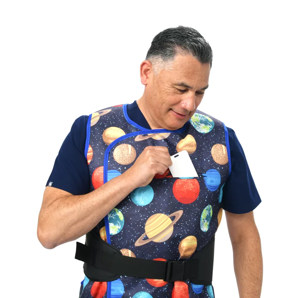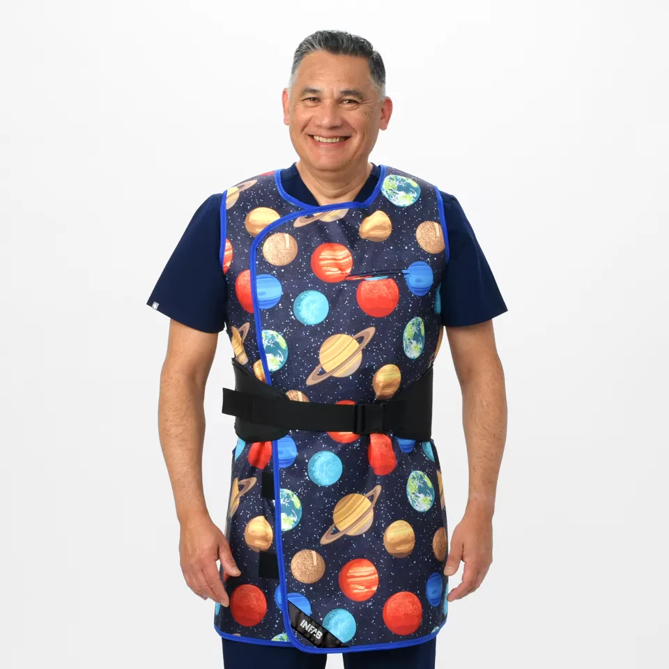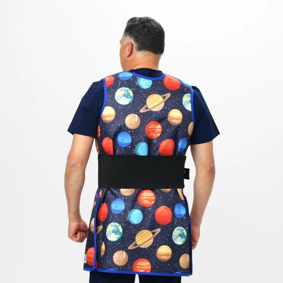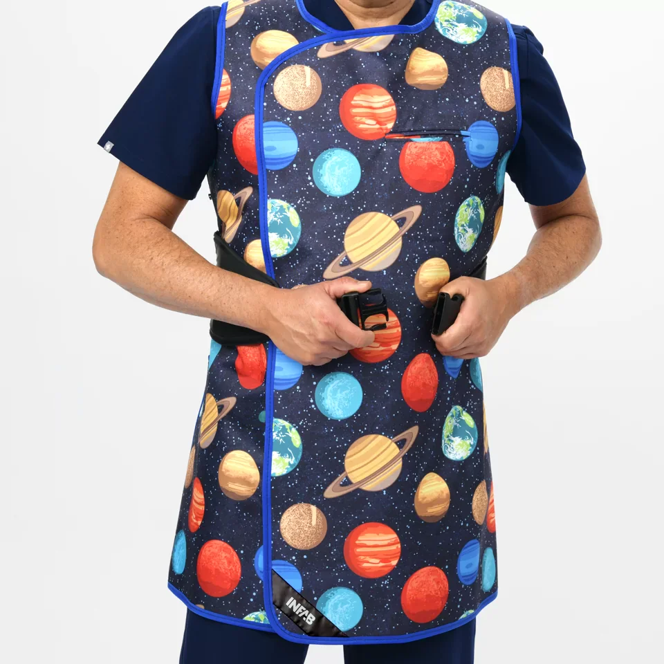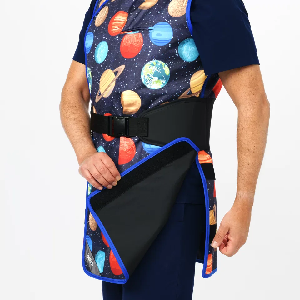 - (1) capa en cada panel frontal (2 capas cuando se superponen) proporcionando .50mm Pb (95.6% de atenuación de haz directo a 80 kVp) en el solapamiento del panel