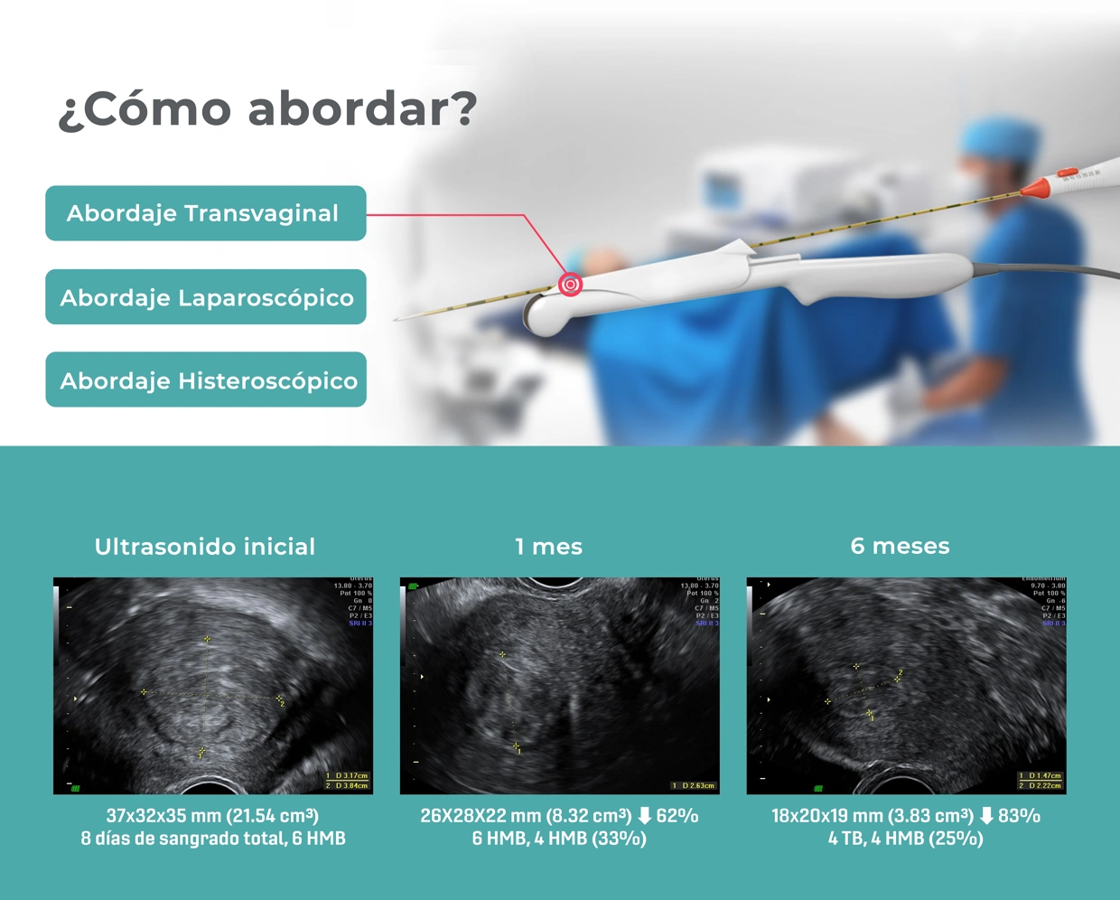 La ablación por radiofrecuencia es un procedimiento seguro y eficaz para los miomas uterinos. Los tiempos quirúrgicos son más cortos en comparación con los enfoques laparoscópicos o histeroscopicos.